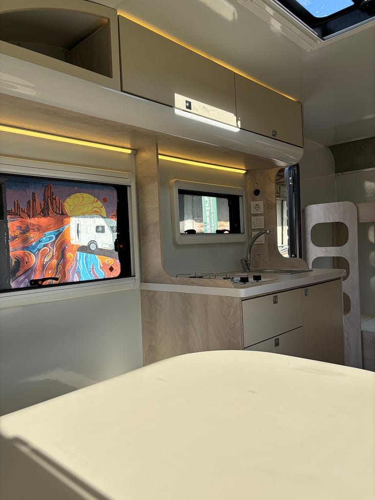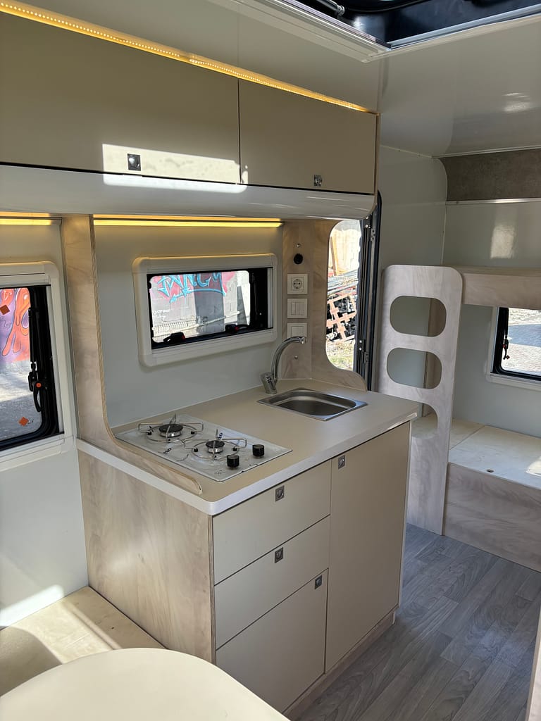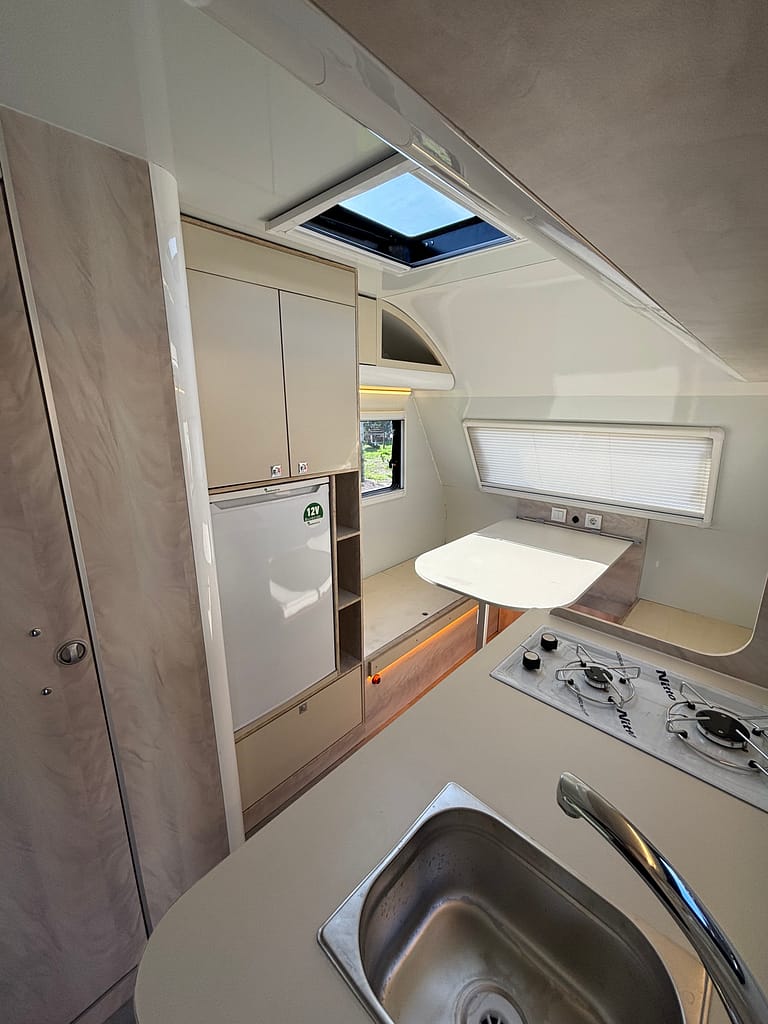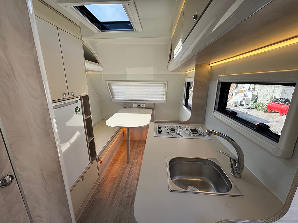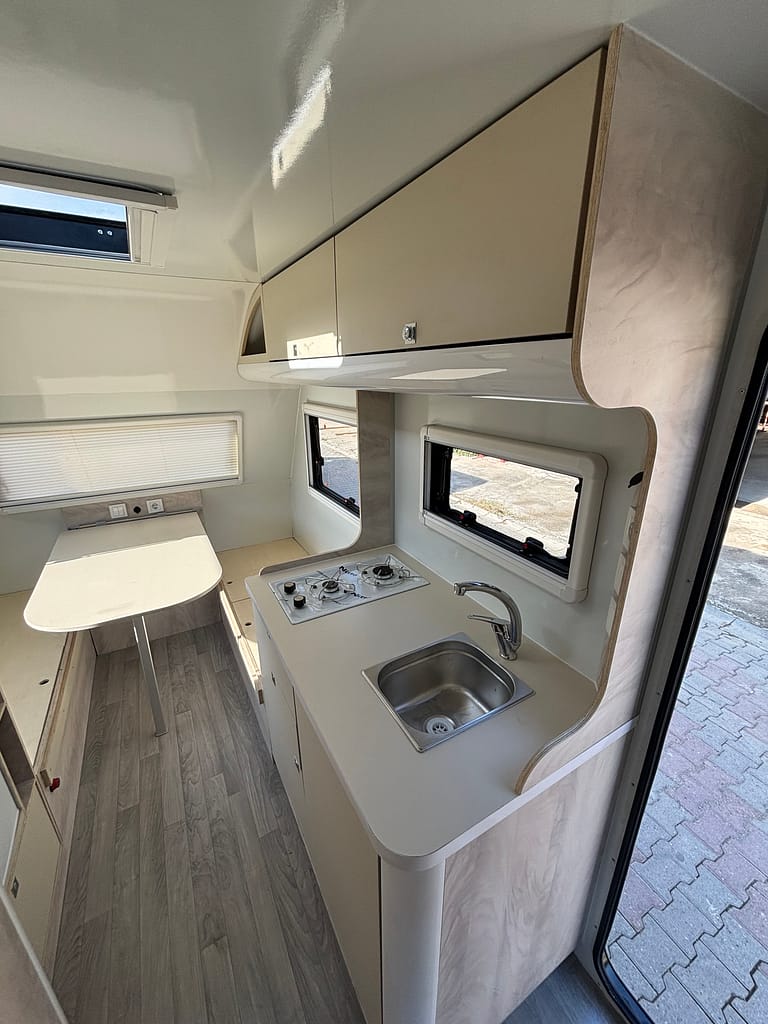 Kaliteden taviz vermeyen yüksek profilli üretim anlayışı çerçevesinde tamamı yuvarlatılmış dönüşlerle şekillendirilen mobilya elemanları bir karavanda ihtiyacınız olabilecek tüm detaylara sahip. Arka bölümde yer alan ranza ve ön taraftaki çift kişilik yatağı onu 4 kişilik bir ailenin vazgeçilmezi yapmaya aday.